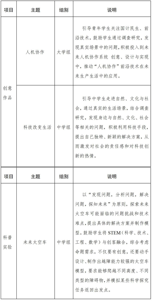 1.创意作品项目:突出发现和解决实际问题的能力,分为大学组和中学组,鼓励学生在相关背景下发现身边问题,并提出解决方案,设计系统模型,创作相关作品。