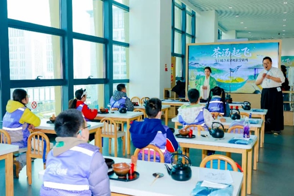 中午,小科学家们在彭州本地非遗湔江黄茶制作技艺代表性传承人何丽荣老师及其团队的指导下,将宋代点茶技艺“茶百戏”与航空元素创意融合,用茶筅在茶汤上亲手点制属于同学们自己的“航空茶花”,同时见证了“茶汤起飞”的魔法时刻。